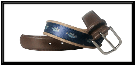 Blue Webbing Canvas Belt for men, with brown leather trim.