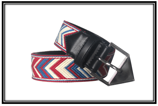 Main body of belt is stripy elasticated fabric in red white and blue.