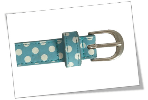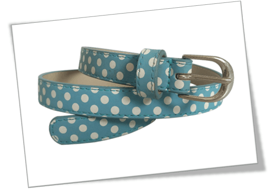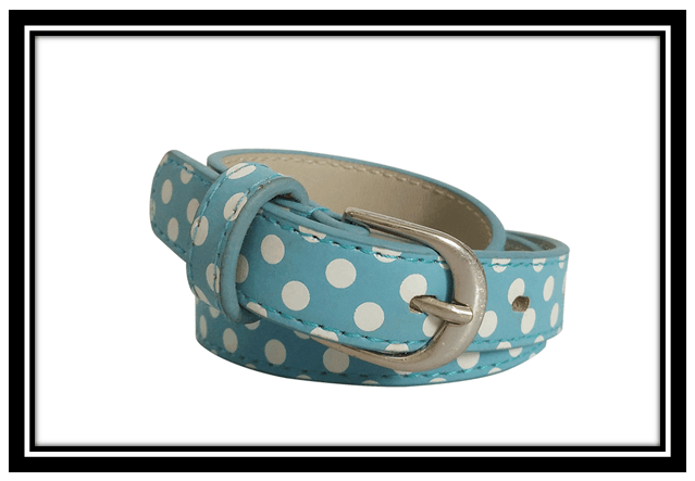 This is a girls belt made of Shining PU in blue with a nickle polish buckle and round-shaped decoration.